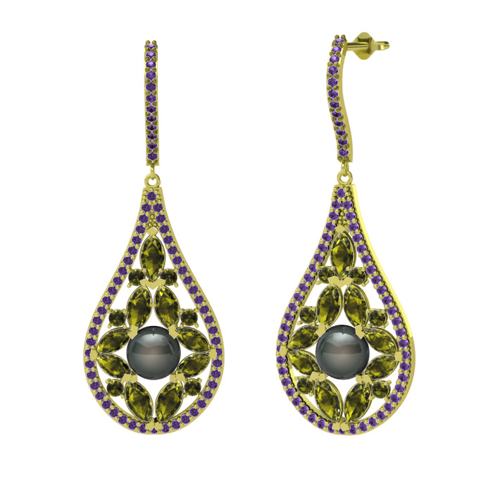 Siyah inci, peridot ve ametist 14 ayar altın küpe