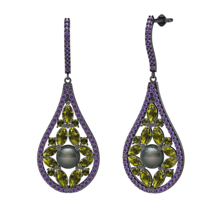 Siyah inci, peridot ve ametist 925 ayar siyah rodyum kaplama gümüş küpe