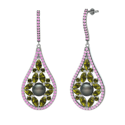 Siyah inci, peridot ve pembe kuvars 14 ayar beyaz altın küpe