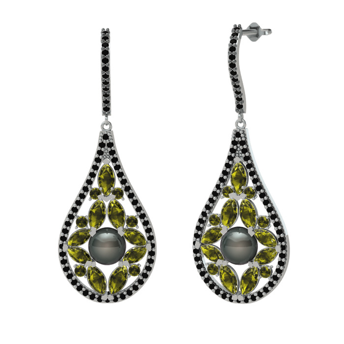Siyah inci, peridot ve siyah zirkon 18 ayar beyaz altın küpe