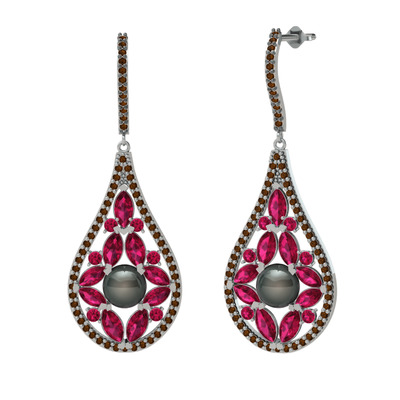 Siyah inci, rodolit garnet ve dumanlı kuvars 18 ayar beyaz altın küpe