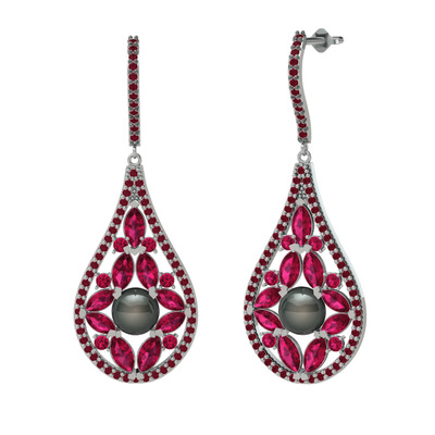Siyah inci, rodolit garnet ve kök yakut 18 ayar beyaz altın küpe