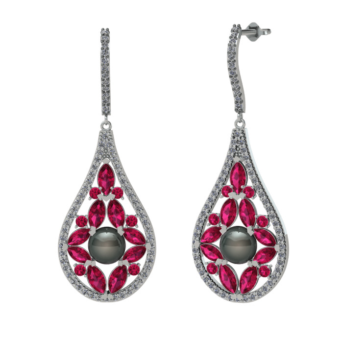 Siyah inci, rodolit garnet ve pırlanta 925 ayar gümüş küpe (1.11 karat)