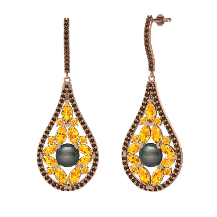 Siyah inci, sitrin ve dumanlı kuvars 8 ayar rose altın küpe