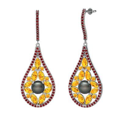 Siyah inci, sitrin ve garnet 18 ayar beyaz altın küpe