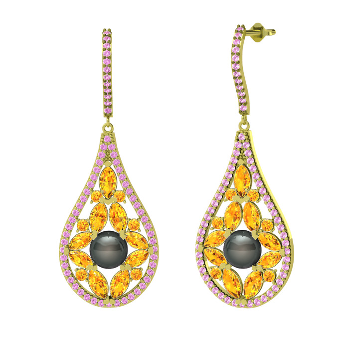 Siyah inci, sitrin ve pembe kuvars 14 ayar altın küpe