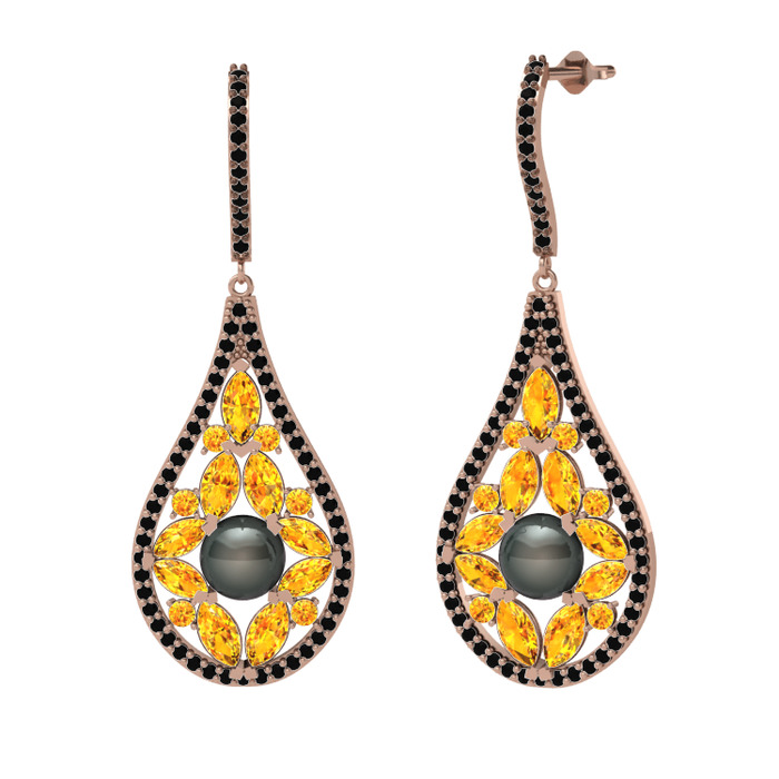 Siyah inci, sitrin ve siyah zirkon 8 ayar rose altın küpe