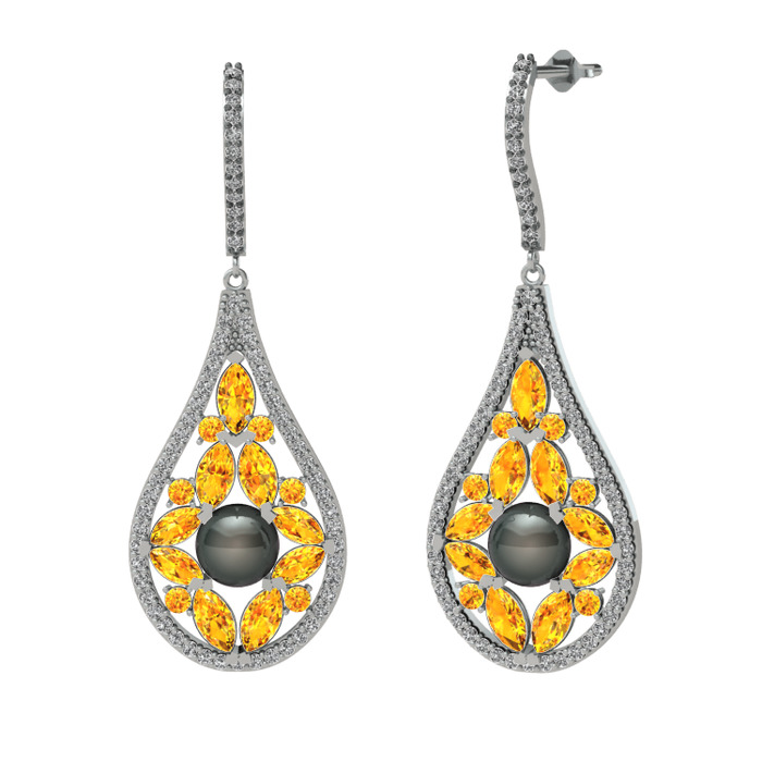 Siyah inci, sitrin ve swarovski 18 ayar beyaz altın küpe