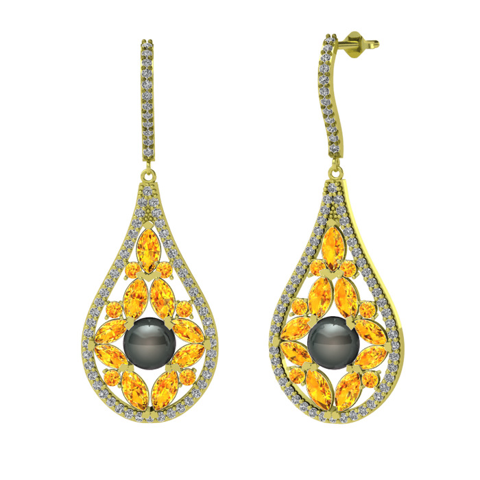 Siyah inci, sitrin ve swarovski 8 ayar altın küpe