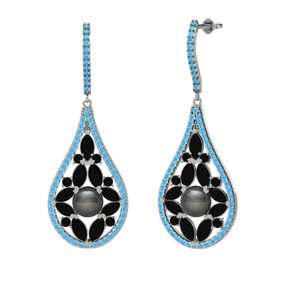 Siyah inci, siyah zirkon ve akuamarin 8 ayar beyaz altın küpe