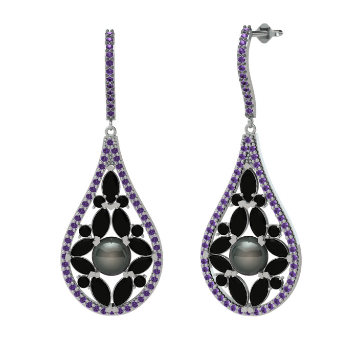 Siyah inci, siyah zirkon ve ametist 14 ayar beyaz altın küpe