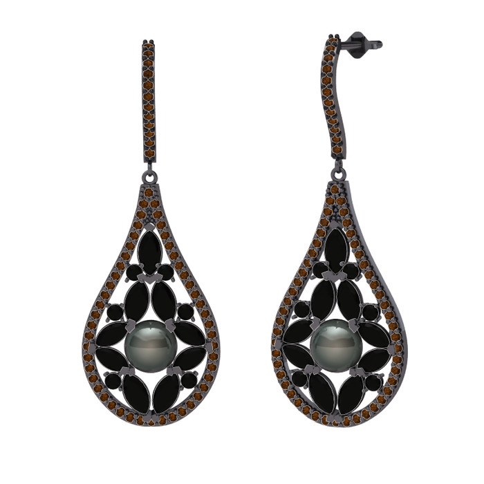 Siyah inci, siyah zirkon ve dumanlı kuvars 925 ayar siyah rodyum kaplama gümüş küpe