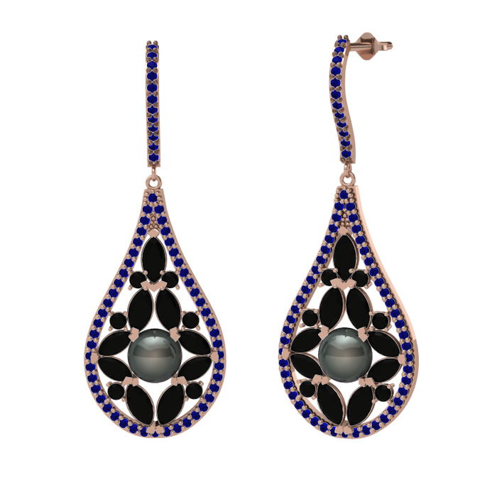 Siyah inci, siyah zirkon ve lab safir 18 ayar rose altın küpe