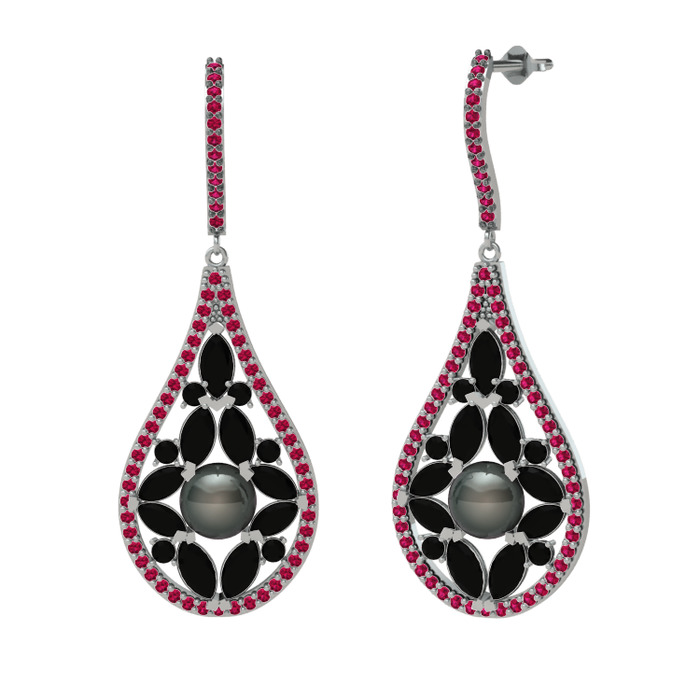 Siyah inci, siyah zirkon ve rodolit garnet 18 ayar beyaz altın küpe