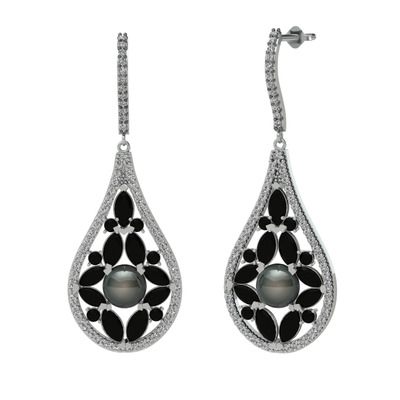 Siyah inci, siyah zirkon ve swarovski 18 ayar beyaz altın küpe