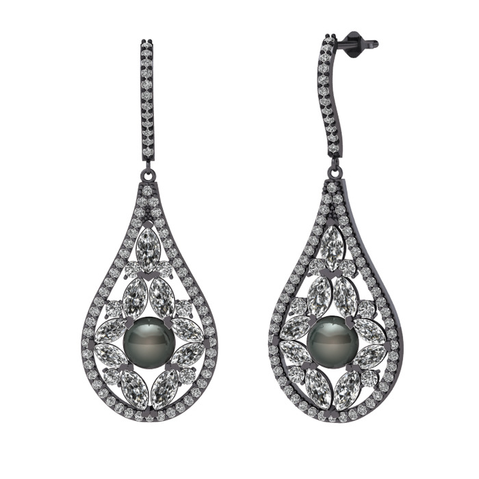 Siyah inci, swarovski ve beyaz zirkon 925 ayar siyah rodyum kaplama gümüş küpe