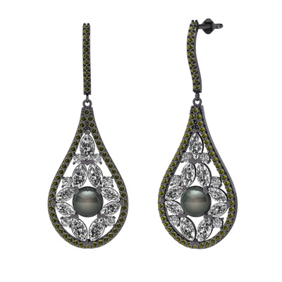 Siyah inci, swarovski ve peridot 925 ayar siyah rodyum kaplama gümüş küpe