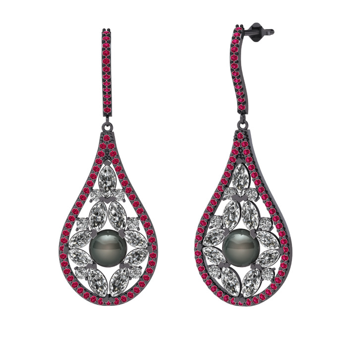Siyah inci, swarovski ve rodolit garnet 925 ayar siyah rodyum kaplama gümüş küpe