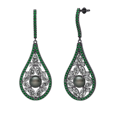 Siyah inci, swarovski ve yeşil kuvars 925 ayar siyah rodyum kaplama gümüş küpe