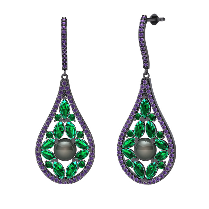 Siyah inci, yeşil kuvars ve ametist 925 ayar siyah rodyum kaplama gümüş küpe
