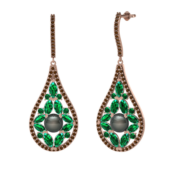 Siyah inci, yeşil kuvars ve dumanlı kuvars 14 ayar rose altın küpe