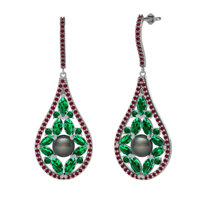 Siyah inci, yeşil kuvars ve kök yakut 18 ayar beyaz altın küpe