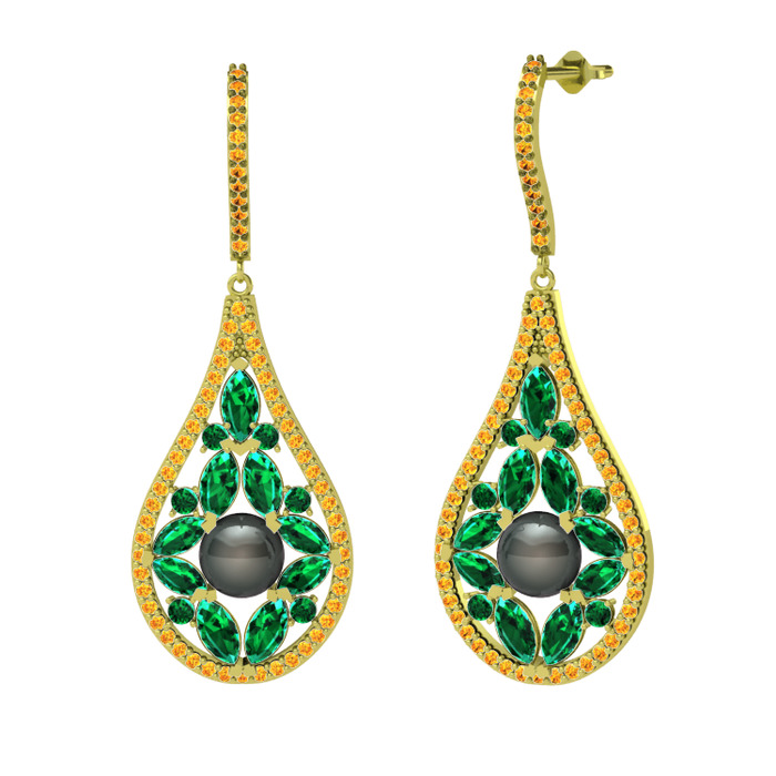 Siyah inci, yeşil kuvars ve sitrin 8 ayar altın küpe