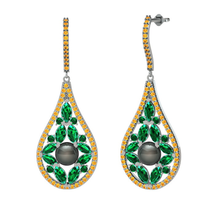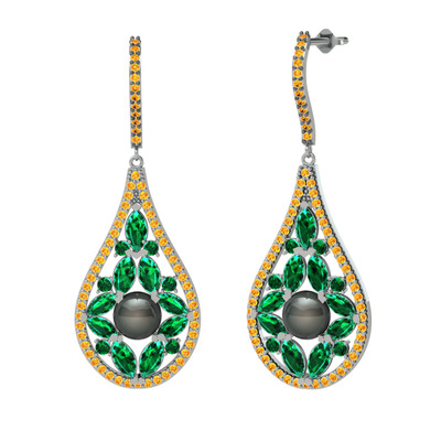 Siyah inci, yeşil kuvars ve sitrin 8 ayar beyaz altın küpe