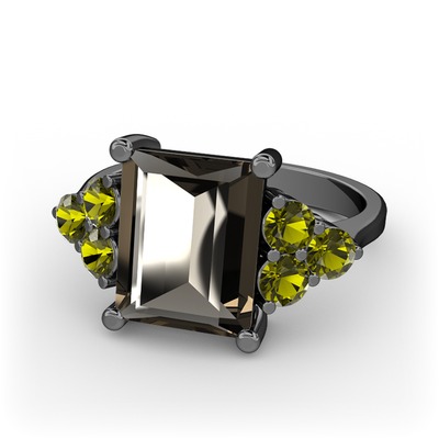 Dumanlı kuvars ve peridot 925 ayar siyah rodyum kaplama gümüş yüzük