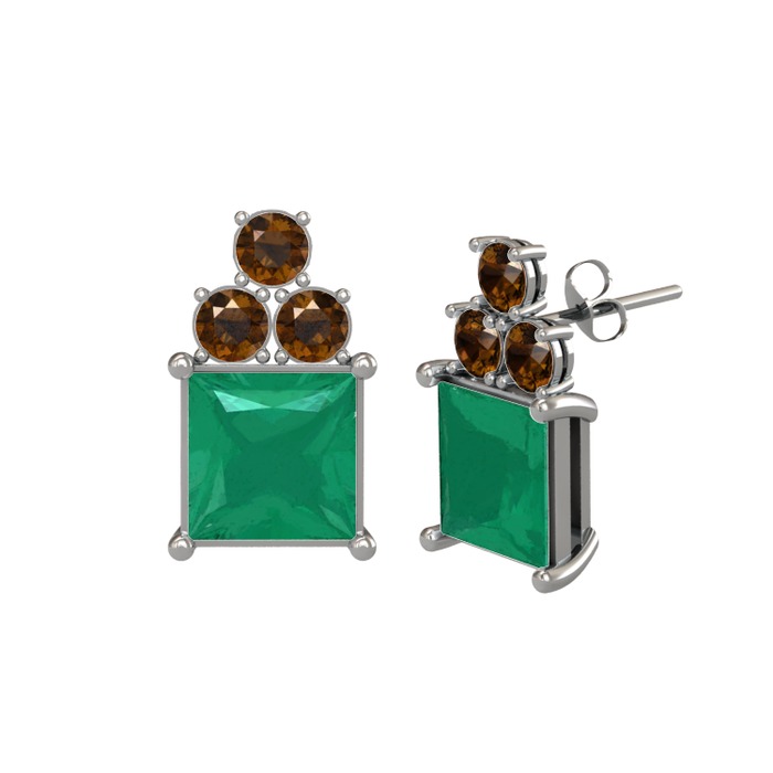 Kök zümrüt ve dumanlı kuvars 14 ayar beyaz altın küpe