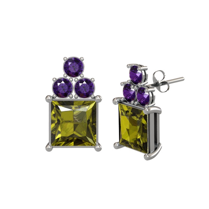 Peridot ve ametist 8 ayar beyaz altın küpe