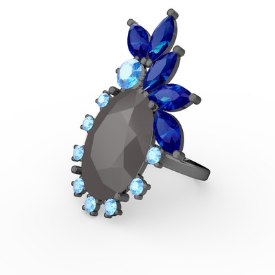 Füme akrilik, lab safir ve akuamarin 925 ayar siyah rodyum kaplama gümüş yüzük
