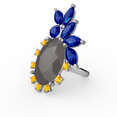 Füme akrilik, lab safir ve sitrin 18 ayar beyaz altın yüzük
