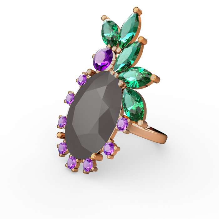 Füme akrilik, yeşil kuvars ve ametist 8 ayar altın yüzük