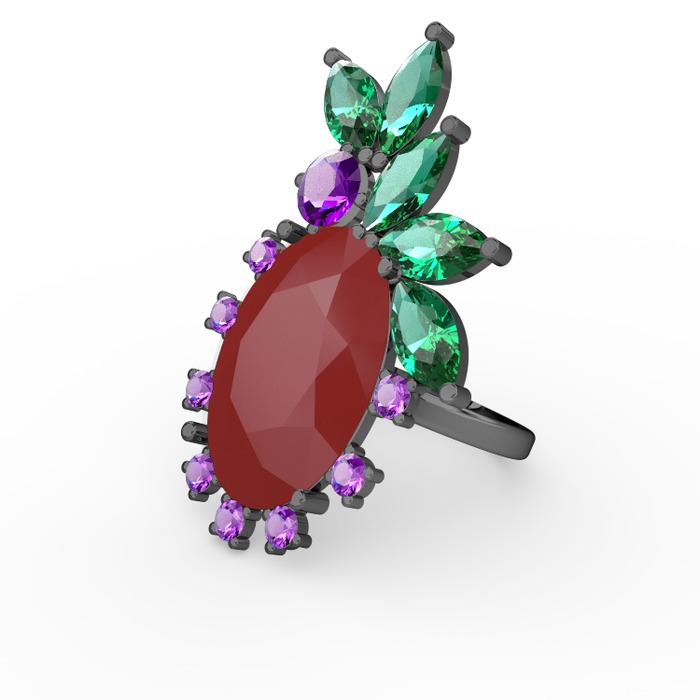 Kırmızı akrilik, yeşil kuvars ve ametist 925 ayar siyah rodyum kaplama gümüş yüzük