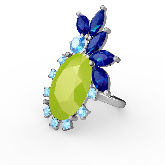Neon sarı akrilik, lab safir ve akuamarin 18 ayar beyaz altın yüzük