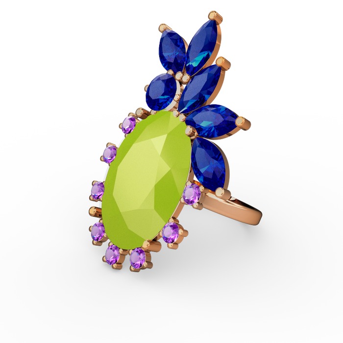 Neon sarı akrilik, lab safir ve ametist 925 ayar rose altın kaplama gümüş yüzük