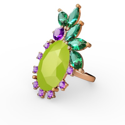 Neon sarı akrilik, yeşil kuvars ve ametist 18 ayar altın yüzük
