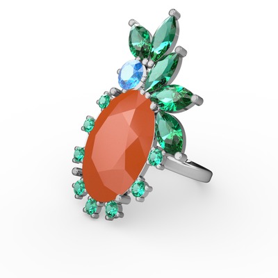 Neon turuncu akrilik, yeşil kuvars ve akuamarin 18 ayar beyaz altın yüzük