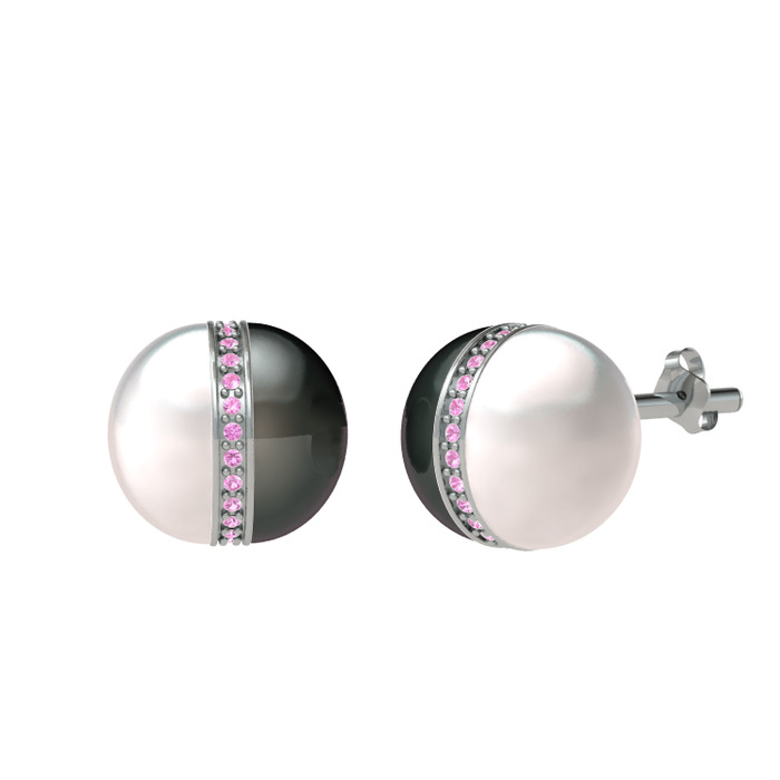 Inci, siyah inci ve pembe kuvars 18 ayar beyaz altın küpe