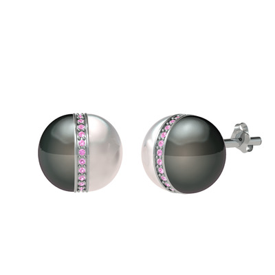 Siyah inci, inci ve pembe kuvars 18 ayar beyaz altın küpe