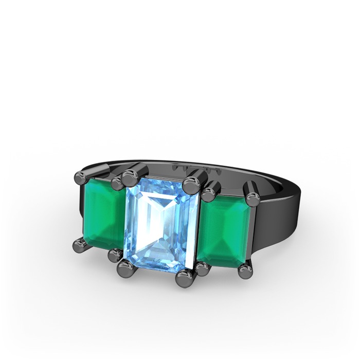 Akuamarin ve kök zümrüt 925 ayar siyah rodyum kaplama gümüş yüzük