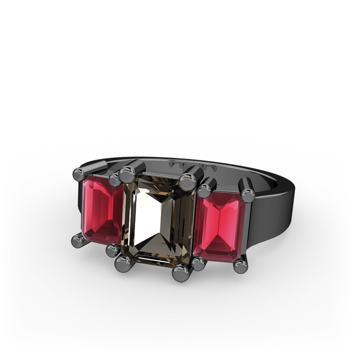 Dumanlı kuvars ve kök yakut 925 ayar siyah rodyum kaplama gümüş yüzük