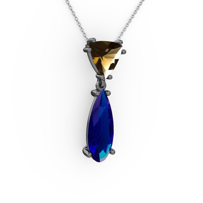Dumanlı kuvars ve lab safir 925 ayar siyah rodyum kaplama gümüş kolye (40 cm beyaz altın rolo zincir)