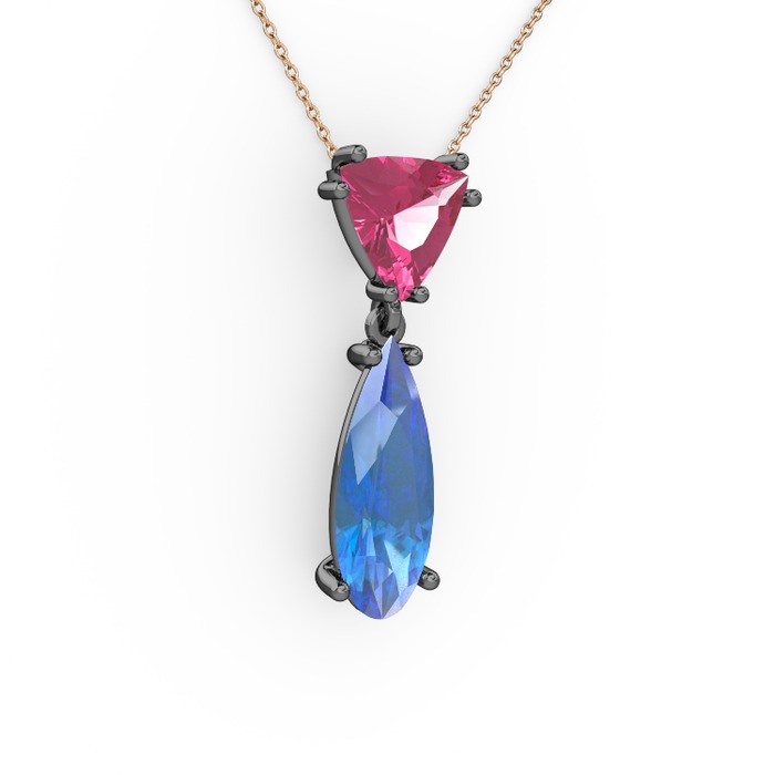 Pembe kuvars ve akuamarin 925 ayar siyah rodyum kaplama gümüş kolye (40 cm rose altın rolo zincir)