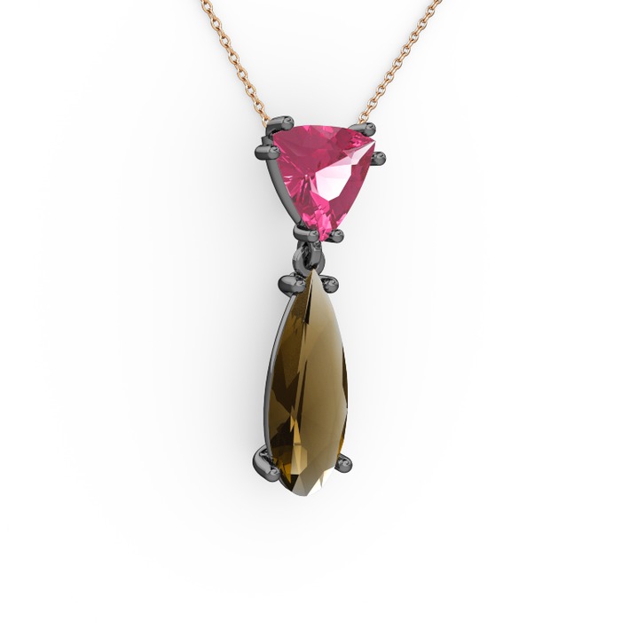 Pembe kuvars ve dumanlı kuvars 925 ayar siyah rodyum kaplama gümüş kolye (40 cm rose altın rolo zincir)