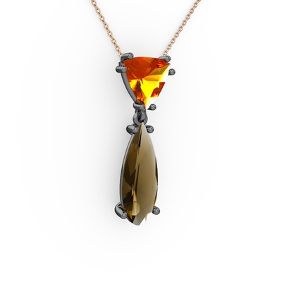 Sitrin ve dumanlı kuvars 925 ayar siyah rodyum kaplama gümüş kolye (40 cm rose altın rolo zincir)