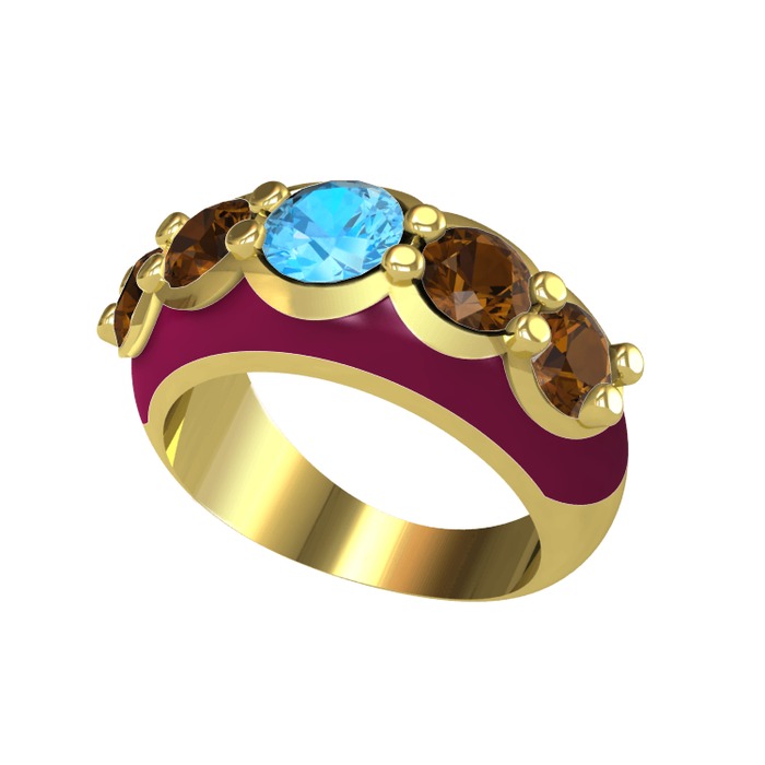 Akuamarin ve dumanlı kuvars 8 ayar altın yüzük (Bordo kırmızı mineli)