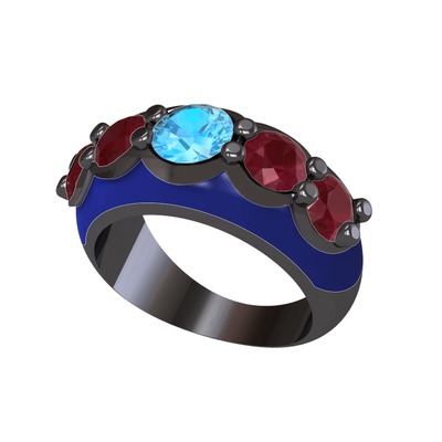 Akuamarin ve kök yakut 925 ayar siyah rodyum kaplama gümüş yüzük (Lacivert mineli)