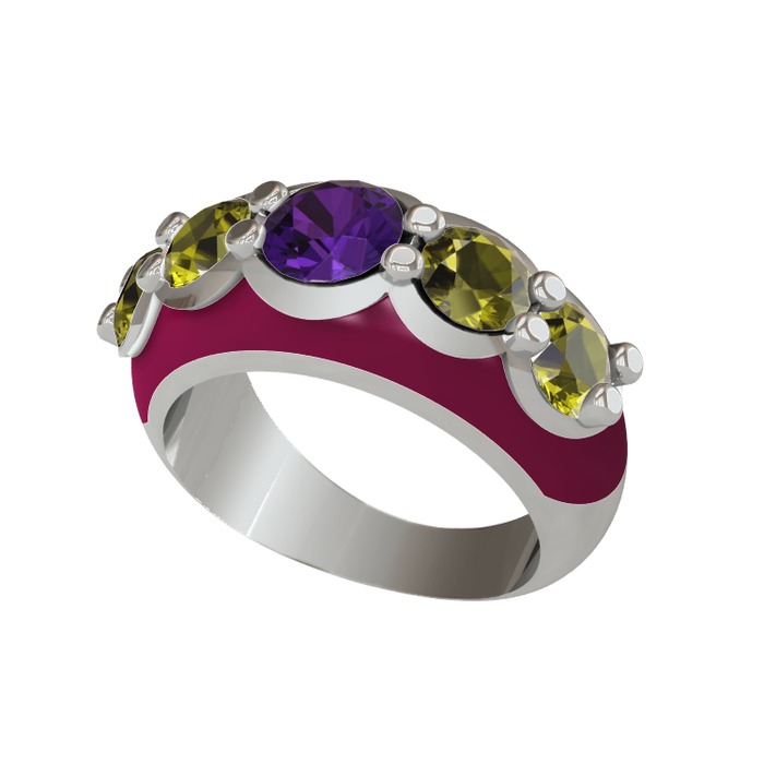 Ametist ve peridot 18 ayar beyaz altın yüzük (Bordo kırmızı mineli)
